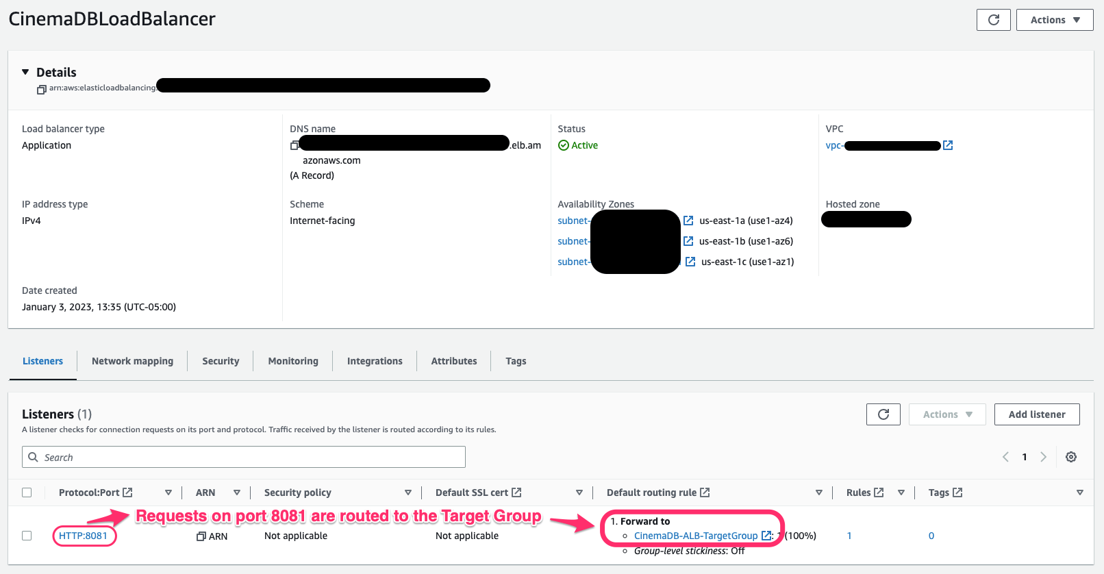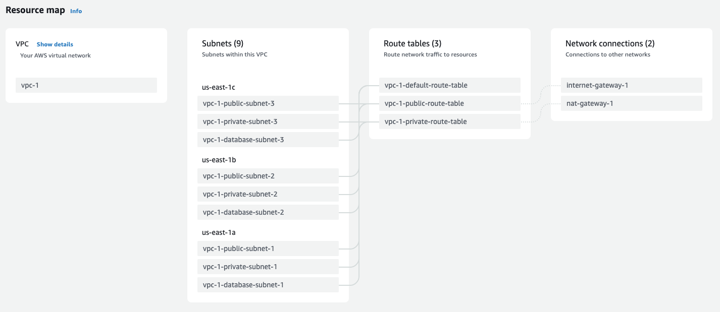 VPC configuration: 3 public, 3 private, and 3 database subnets. Public subnets route to internet gateway and private subnets route to NAT gateway